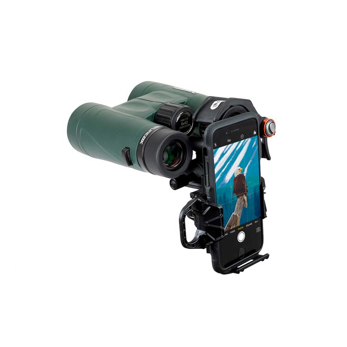 NOTA: NexYZ es compatible con telescopios, teleobjetivos, binoculares, monoculares y microscopios. No se ajusta a visores. NexYZ funciona con la mayoría de las fundas de teléfono, pero si tiene una funda de teléfono especialmente grande con baterías incorporadas o una funda tipo folio, deberá quitarla.